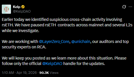 Kelp DAO responded by freezing core contracts within 46 minutes of detecting the exploit, successfully blocking two additional attempts that aimed to withdraw another 40,000 rsETH.