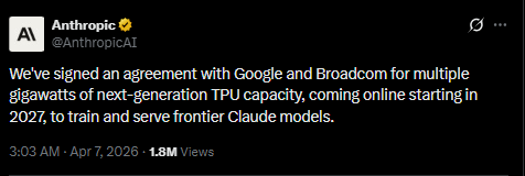 Anthropic announced a partnership with Google and Broadcom to secure multiple gigawatts of next-generation TPU compute capacity, scheduled to begin coming online in 2027. The agreement marks the company’s most significant infrastructure commitment to date and follows rapid revenue expansion to a $30 billion annual run rate, up sharply from $9 billion at the end of 2025.