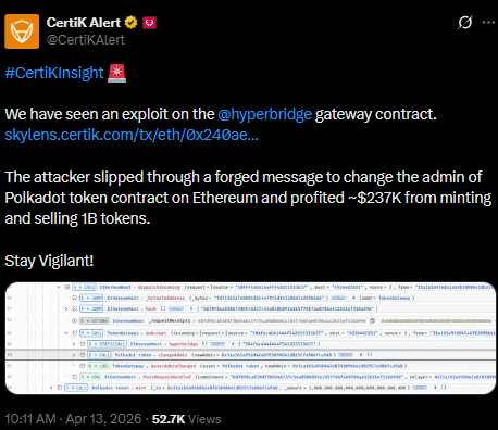 A security breach in Hyperbridge’s Ethereum gateway contract allowed an attacker to mint 1 billion bridged Polkadot (DOT) tokens on Ethereum, later converting them into roughly $237,000 worth of ether. The exploit did not impact the Polkadot main network or native DOT supply, but targeted the bridge’s flawed cross-chain validation logic.
