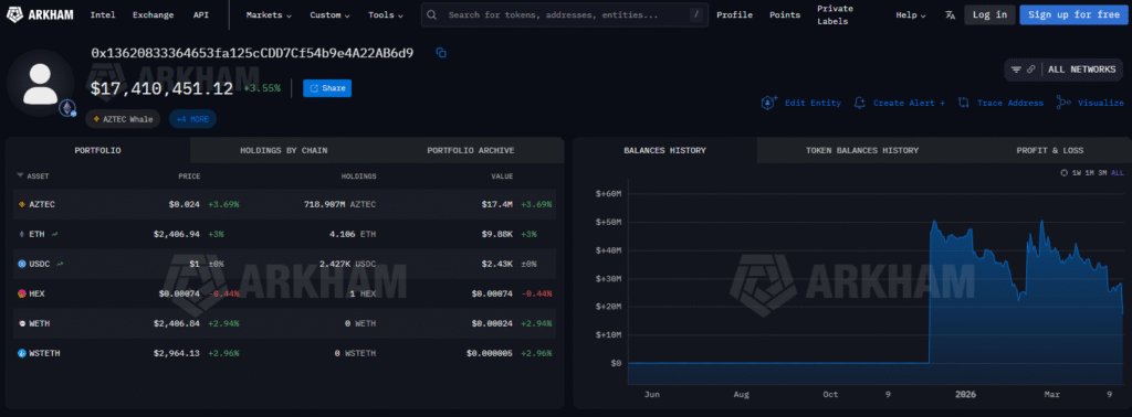 The Aztec team has completed the transfer of all Ether collected during its December public token auction, marking the end of a months long movement of treasury funds. During the public sale held in December 2025, the project sold 15% of its total AZTEC token supply, equal to 1.5 billion tokens. The auction generated 19,388.4 ETH, valued at approximately $59.13 million at the time, with an average sale price near $0.0473 per token according to Arkham. Current market levels place the token at roughly 50% below the original auction price, reflecting broader market pressure and post launch volatility.
