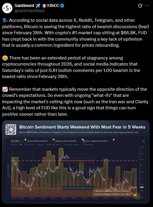 Recent data shows social media sentiment turning heavily bearish, with roughly five bearish posts for every four bullish ones, marking the weakest outlook in about five weeks. The last time sentiment reached similar levels was during Operation Epic Fury, when bitcoin briefly fell below $65,000.