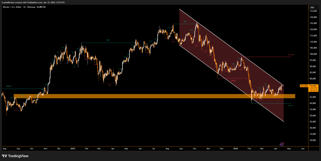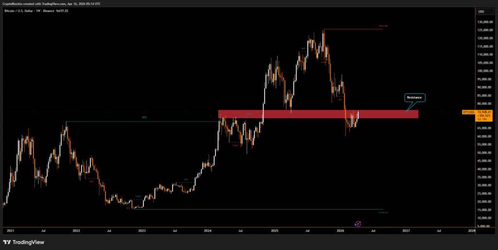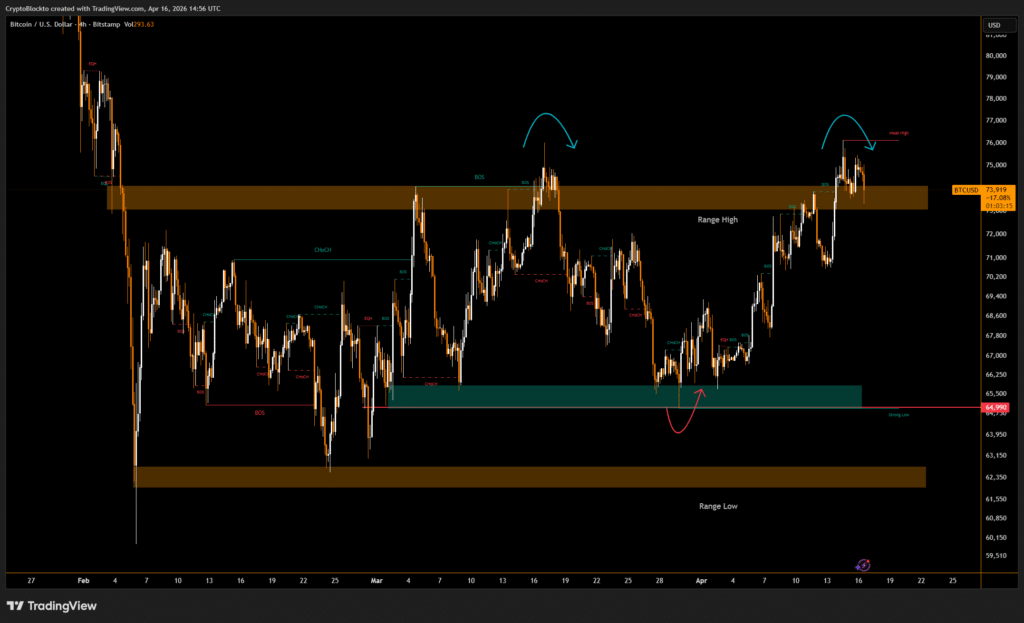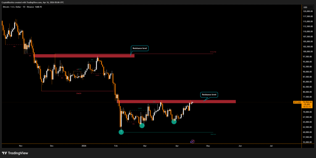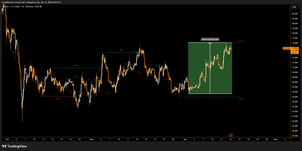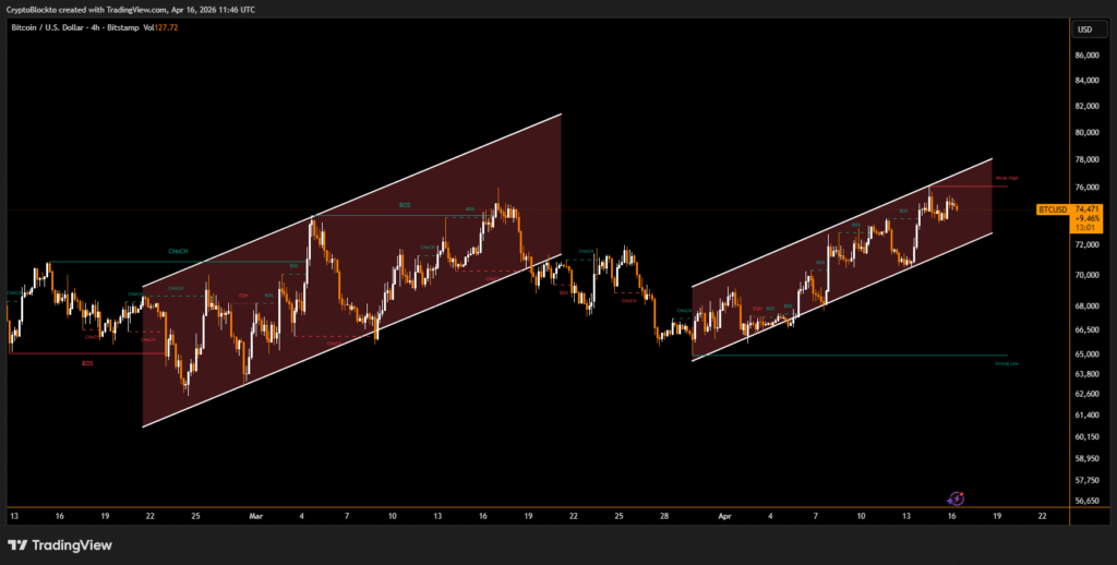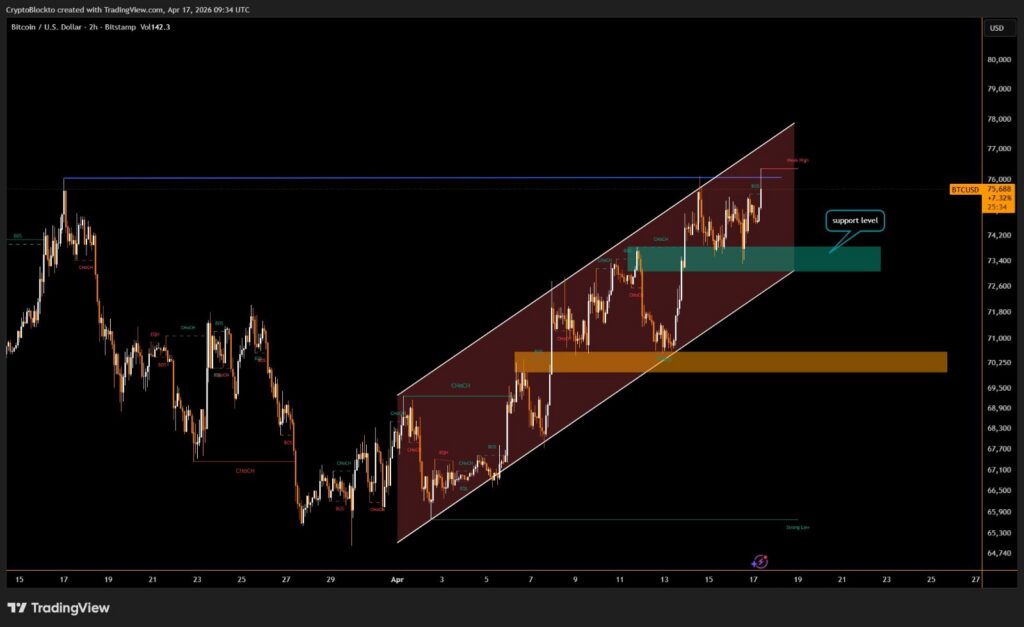 Market participants now appear to be waiting for concrete developments rather than relying on ceasefire headlines alone. Bitcoin’s chart structure suggests a bullish trend, but momentum is being capped by a double-top resistance forming near the $76,000 level.