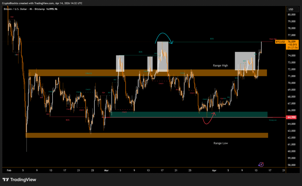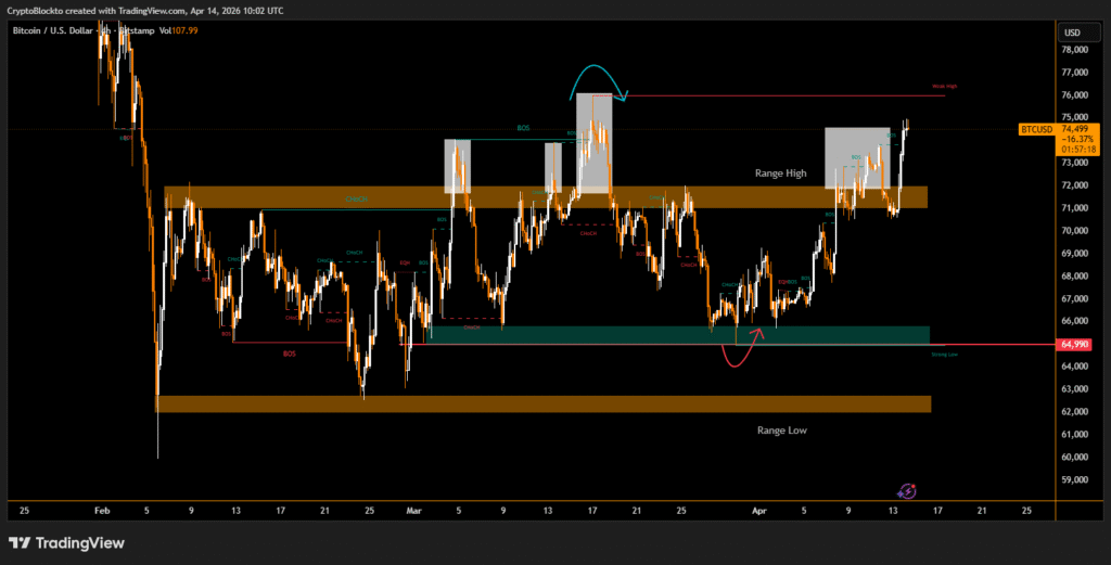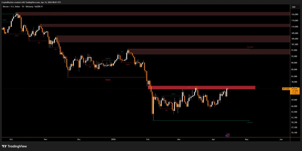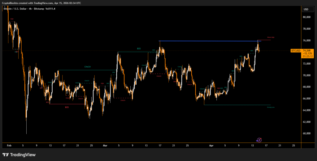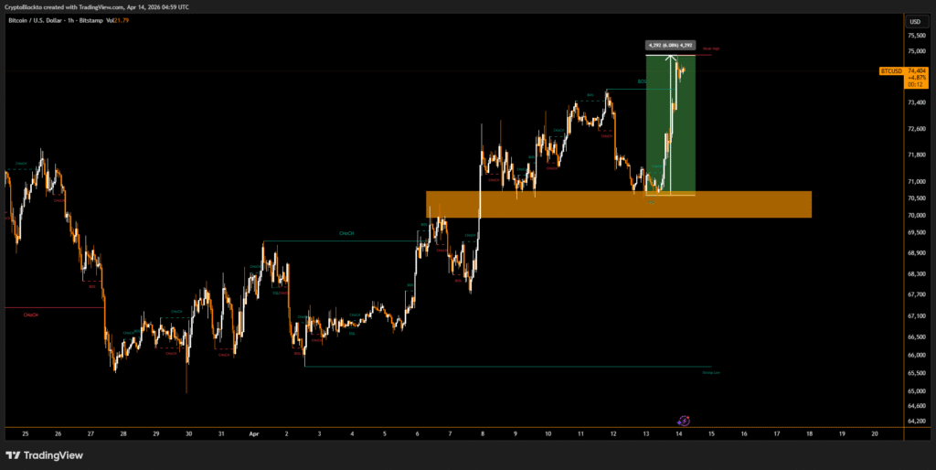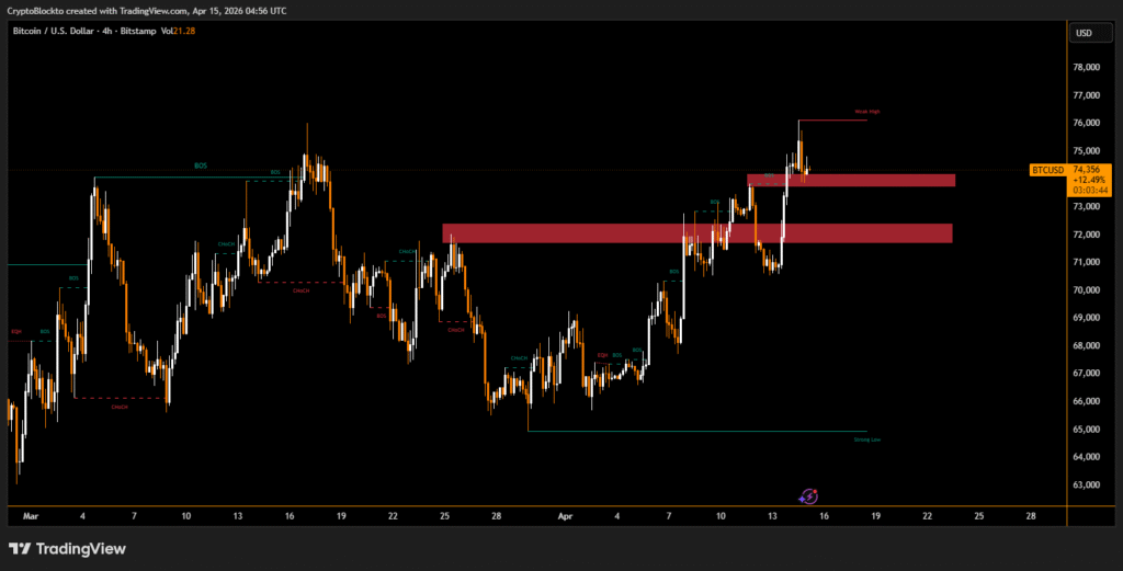 At the same time, Bitcoin’s market price briefly rose above $75,000, reaching its highest level since mid-March before pulling back to trade slightly below $74,000. Market sentiment also showed signs of improvement, with the Crypto Fear & Greed Index moving above 21, indicating cautious optimism returning to the digital asset market.