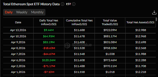 Positive flows extended beyond Bitcoin-focused funds. Spot Ether ETFs recorded about $53 million in inflows, while XRP funds added $11 million, Solana funds gained just over $1 million, and Dogecoin ETFs brought in roughly $187,000, lifting cumulative inflows to about $9.2 million.