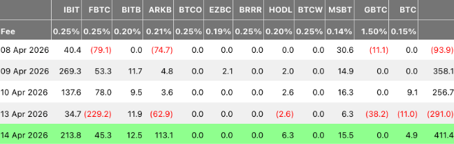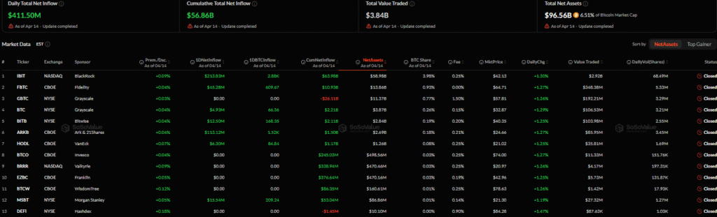 US listed spot Bitcoin ETFs recorded $411.5 million in inflows on Tuesday, marking the second largest daily inflow of April and pushing 2026 year to date net flows to about $245 million according to SoSoValue data. The rebound lifted total assets under management above $96.5 billion, the highest level seen since mid March.
