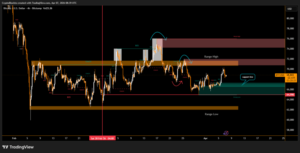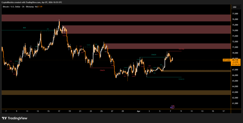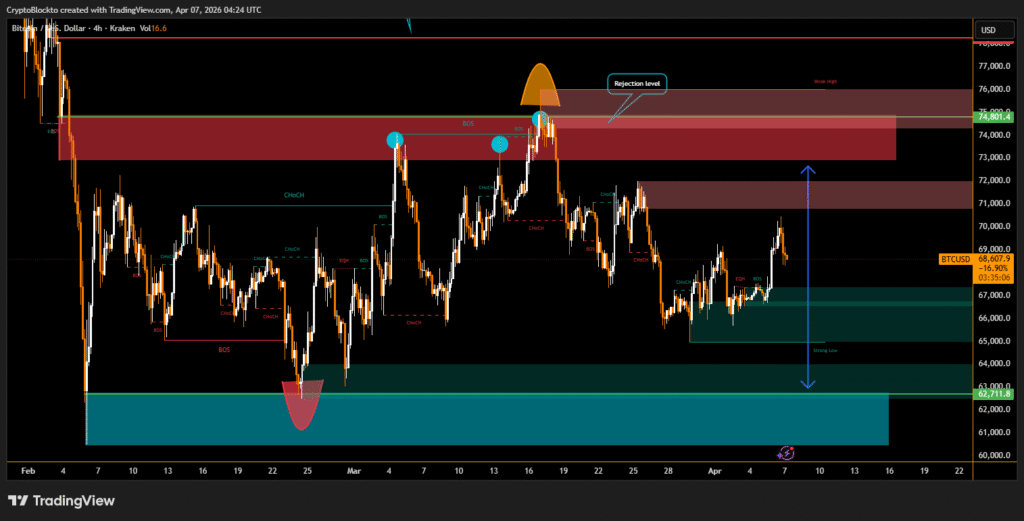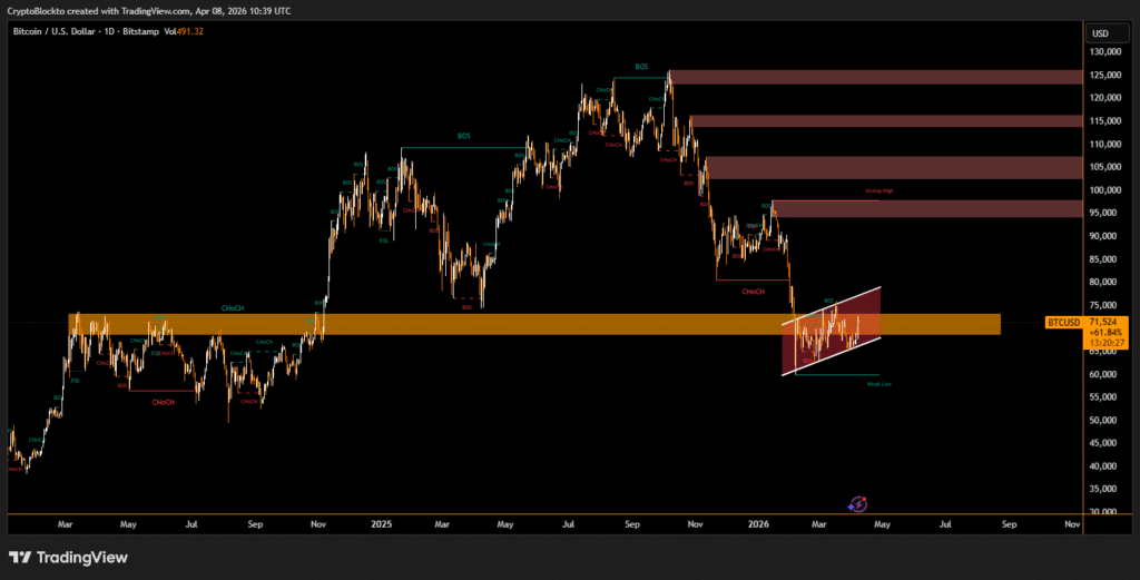 Despite the rally, traders remain cautious about a sustained breakout. Bitcoin bulls still face strong resistance within the $72,000–$76,000 range, describing the pattern as a potential bearish flag.