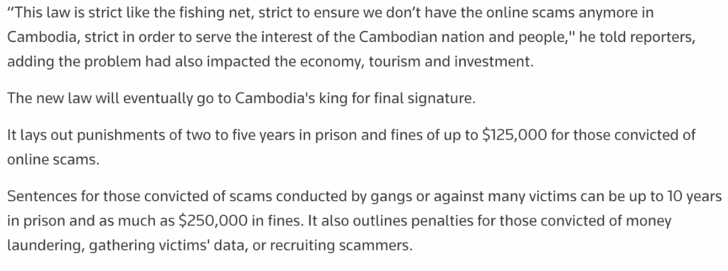 The bill will now be submitted to Cambodia’s king for final approval. Once enacted, it will provide the country with its first comprehensive legal framework specifically designed to combat cross-border online scams and related financial crimes.