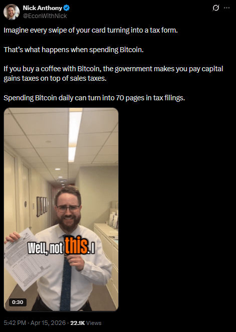 Under existing U.S. law, using crypto to purchase goods or services can trigger a taxable event, similar to selling stocks or real estate. Anthony noted that frequent small transactions such as daily purchases can result in complex reporting requirements, making crypto less practical as a currency.