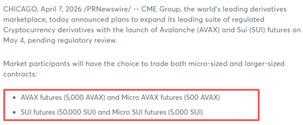 CME will launch Avalanche (AVAX) and Sui (SUI) futures, including standard and micro contracts. Traders can access 5,000 AVAX or 500 AVAX and 50,000 SUI or 5,000 SUI contracts. Giovanni Vicioso, CME Global Head of Cryptocurrency Products, said the new offerings provide “greater choice, enhanced flexibility and more capital efficiencies across our deeply liquid, regulated crypto derivatives complex.”
