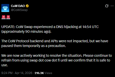 The decentralized exchange aggregator CoW Swap has warned users to stay away from its platform after its domain was hijacked in a suspected DNS attack. In a public update, the decentralized autonomous organization behind the protocol confirmed that the incident affected its main website, forcing the shutdown of backend services and APIs while the issue is being investigated.