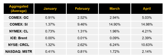 During March and April, tokenized silver volumes accounted for 14.90% and 14.98% of Comex trading activity, a sharp increase from 1.37% recorded in January. This growth reflects rising demand for 24/7 access to commodities trading, a feature not available in traditional markets with fixed trading hours.