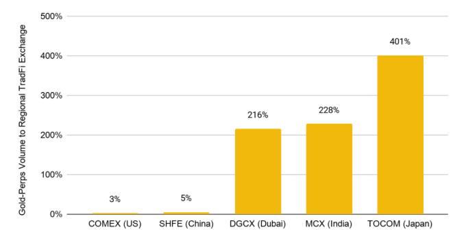 Gold perpetual contracts have already surpassed trading volumes on several regional commodity exchanges. In March, gold perps reached 401% of Japanese TOCOM volumes, 228% of India’s MCX, and 216% of Dubai’s DGCX, highlighting accelerating demand driven by weekend market risks and continuous trading access.