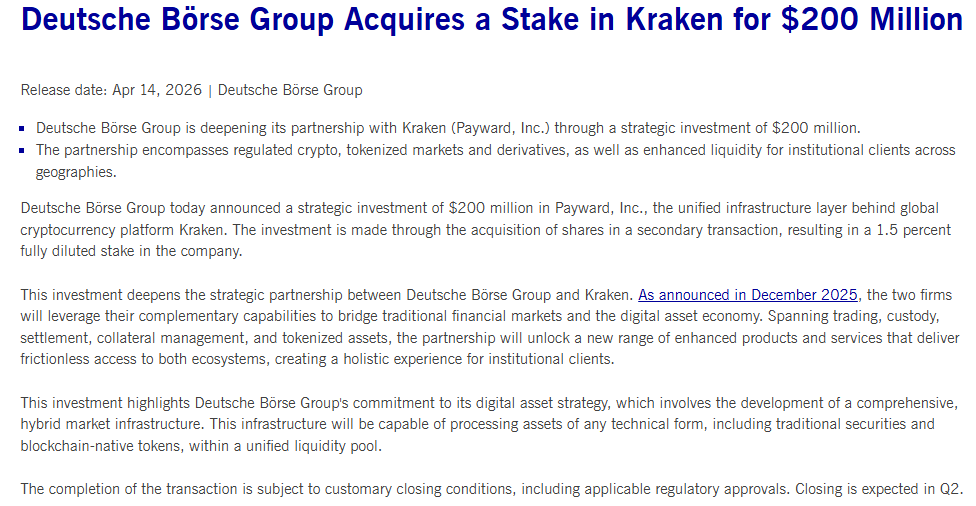 Deutsche Borse announced it will invest $200 million in Payward, the parent company of crypto exchange Kraken, as part of its broader push into blockchain-based financial products. The investment, expected to close in the second quarter pending regulatory approval, will grant Deutsche Börse a 1.5% fully diluted stake through a secondary share purchase.