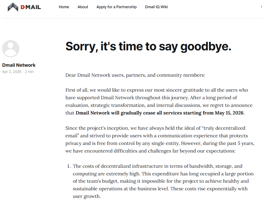 Dmail Network, a decentralized email and messaging platform, has announced it will cease all services starting May 15 after five years of operations. The platform urged users to export their data before the deadline, warning that once nodes shut down, emails and user accounts will become inaccessible.