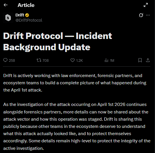 Drift Protocol has released preliminary findings of its investigation into the $285 million theft that occurred on April 1, 2026. The investigation indicates that the attack was a long term, organized infiltration operation lasting approximately six months.