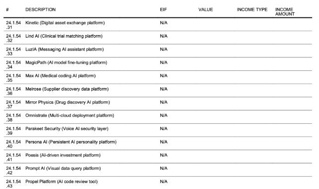 The disclosure listed Excepted Investment Funds (EIFs) connected to crypto firms such as Compound, Dapper Labs, and Kinetic, along with AI-focused companies including Delphi, Conversion, Factory, and Glue. Although his total assets exceed $100 million, the value ranges for several crypto and AI investments were not specified.