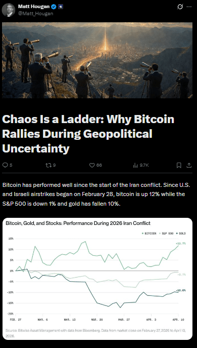 Hougan pointed to discussions around crypto based payments for maritime transit near the Strait of Hormuz as an example of how Bitcoin could function in real-world currency-like scenarios, especially when traditional financial systems face disruption.