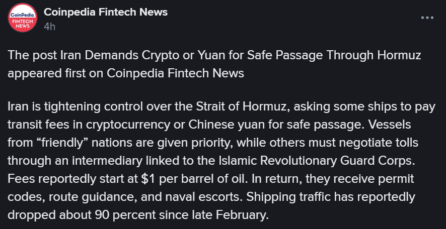 Iran has introduced a new transit payment system requiring ships to pay in cryptocurrencies or Chinese yuan to cross the Strait of Hormuz, transforming the strategic waterway into a tightly controlled passage managed by the Islamic Revolutionary Guard Corps (IRGC). Under the new process, vessels seeking entry must submit detailed operational data, including ownership, cargo details, flag, crew information, destination, and real-time tracking data before receiving approval.