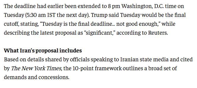 Iran has reportedly presented a 10-point proposal aimed at ending its ongoing conflict with the United States and Israel, according to state media reports. The plan, conveyed via Pakistan, comes amid escalating tensions and a looming deadline set by former US President Donald Trump for Tehran to meet certain conditions. Trump described the proposal as “significant” but reiterated that Tuesday would be the “final deadline.”