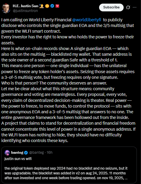 Justin Sun urged the Trump linked World Liberty Financial to disclose who controls the guardian externally owned account (EOA) and multisignature wallets governing its smart contracts. In a recent statement shared on X, Sun alleged that a single guardian EOA tied to WLFI’s multisig appeared to be the sole owner of a second guardian safe, potentially granting one individual unilateral authority to freeze token holders. WLFI has not publicly responded to the technical details of these claims.