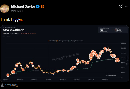 Michael Saylor has signaled that the company is preparing to purchase more BTC after the asset pulled back from recent highs above $73,000. In a post on Sunday, Saylor shared Strategy’s purchase history chart and wrote “Think bigger,” a message often linked to upcoming acquisitions. The company has completed 105 Bitcoin transactions since 2020, consistently using debt and equity financing to expand its holdings.