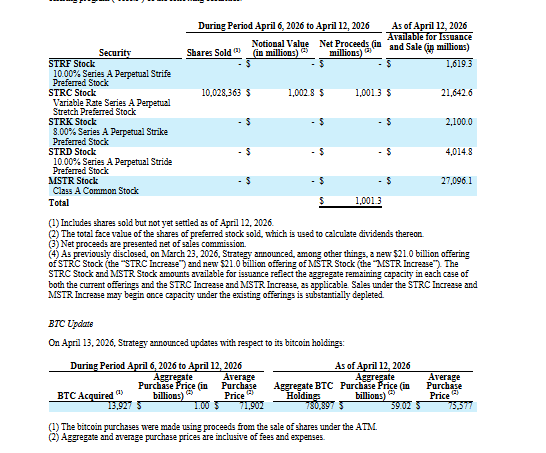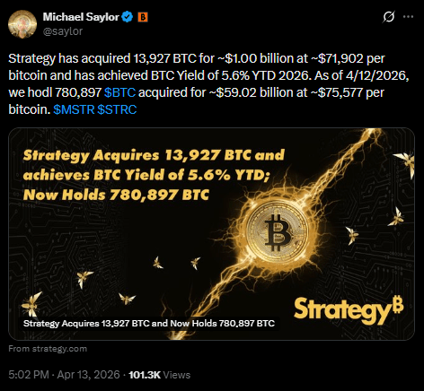 Strategy (Michael Saylor), has purchased 13,927 Bitcoin for approximately $1 billion between April 6 and April 12, according to an SEC filing. The acquisition was made at an average price of $71,902 per BTC, marking one of the company’s largest weekly purchases of the year.