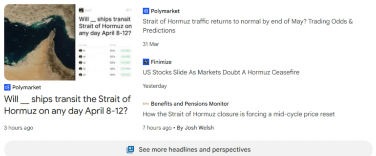 Before its removal, Polymarket links were shown directly beneath major publishers during event-driven searches. One example highlighted involved searches related to vessel movement through the Strait of Hormuz, where a Polymarket prediction market appeared next to traditional reporting sources. Subsequent searches confirmed that these links had disappeared following the correction.