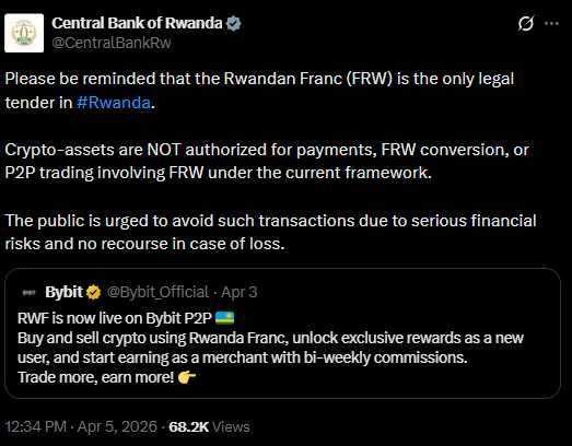 The National Bank of Rwanda has issued a public warning after Bybit introduced support for the Rwandan franc on its peer-to-peer trading platform. Authorities stated that crypto-assets remain unauthorized for payments, currency conversion, or peer-to-peer trading involving the local currency under the current regulatory framework.