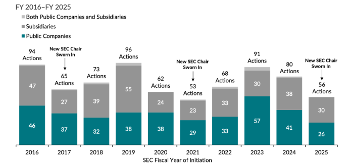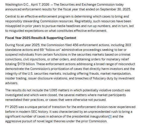 Under SEC Chair Paul Atkins, who assumed the role in April 2025, the agency said it shifted toward prioritizing quality over quantity. Atkins emphasized ending regulation by enforcement and redirecting resources toward cases involving fraud, market manipulation, and abuses of trust. Research from Cornerstone Research showed enforcement actions against public companies dropped by about 30% in fiscal 2025 compared with fiscal 2024.
