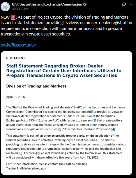 The U.S. Securities and Exchange Commission released a staff statement outlining how broker dealer rules may apply to crypto transaction interfaces. According to the SEC Division of Trading and Markets, certain software interfaces that assist users in conducting crypto asset securities transactions through self-custodial wallets may not need to register as broker-dealers if they meet specific conditions.