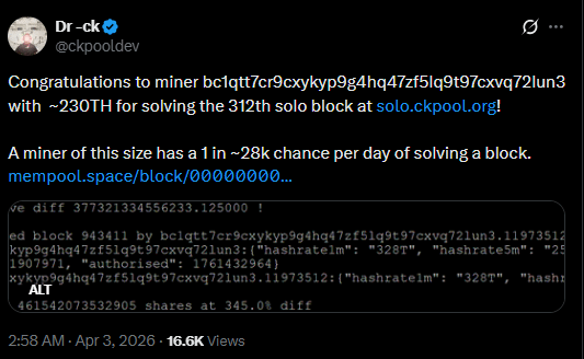 This block marked the 312th solo win recorded on CKpool since its launch and the first since Feb. 28, ending a 33-day gap. Over the past year, solo pools have discovered 20 Bitcoin blocks, distributing a combined 62.96 BTC, averaging one solo block every 18.7 days, with the longest gap lasting 58 days.