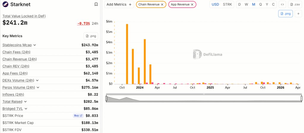 Starknet chain revenue, near $6 million in a single month in late 2023, stood at roughly $48,000 through the first half of April 2026, DefiLlama data.