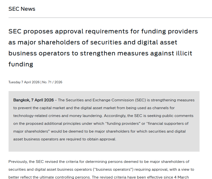 Thailand’s Securities and Exchange Commission (SEC) has proposed tighter funding rules for cryptocurrency companies, aiming to prevent money laundering and technology-related financial crimes. The new rules expand oversight to include financiers behind major shareholders, whether direct or indirect, requiring them to obtain regulatory approval.