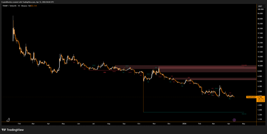 Crypto tokens linked to U.S. President Donald Trump are facing renewed scrutiny after sharp price declines pushed several projects to record lows. The Official Trump (TRUMP) memecoin, launched in January 2025, dropped to an all-time low of about $2.73 in March 2026 and is currently trading near $2.86, according to market data.
