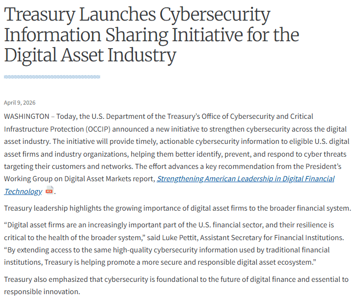 The U.S. Department of the Treasury has announced plans to extend its cybersecurity threat information-sharing program to crypto firms, allowing them to receive the same security alerts previously reserved for traditional financial institutions. The initiative will be managed by the Office of Cybersecurity and Critical Infrastructure Protection, which will provide timely and actionable cybersecurity intelligence to eligible crypto organizations.