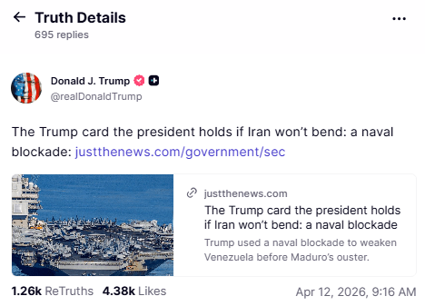U.S. President Donald Trump indicated that stronger measures remain under consideration following the failed negotiations. Shortly after the talks collapsed, Trump shared commentary highlighting a potential naval blockade against Iran, signaling that military or economic pressure options remain on the table.