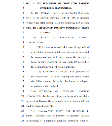 One of the most notable revisions involves treatment of small transactions, commonly referred to as de minimis gains. The earlier draft proposed a $200 exemption threshold for payments made using regulated payment stablecoins, allowing minor purchases such as everyday retail transactions without tax reporting. The March 2026 version removes the fixed threshold but introduces a new rule stating that no gain or loss would be recognized on the sale of regulated payment stablecoins unless the taxpayer’s basis falls below 99% of the redemption value. The bill also introduces a deemed $1 basis for exchange transactions separate from stablecoin sales.