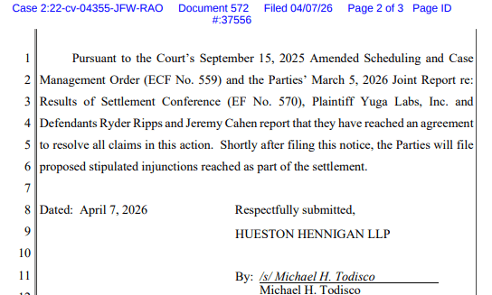 Yuga Labs, creator of the Bored Ape Yacht Club (BAYC), has reached a settlement with artists Ryder Ripps and Jeremy Cahen, who were accused of producing and selling NFTs that closely resembled BAYC’s iconic cartoon ape collection. Court documents filed in the U.S. District Court for the Central District of California confirm that the parties have agreed to resolve the dispute.